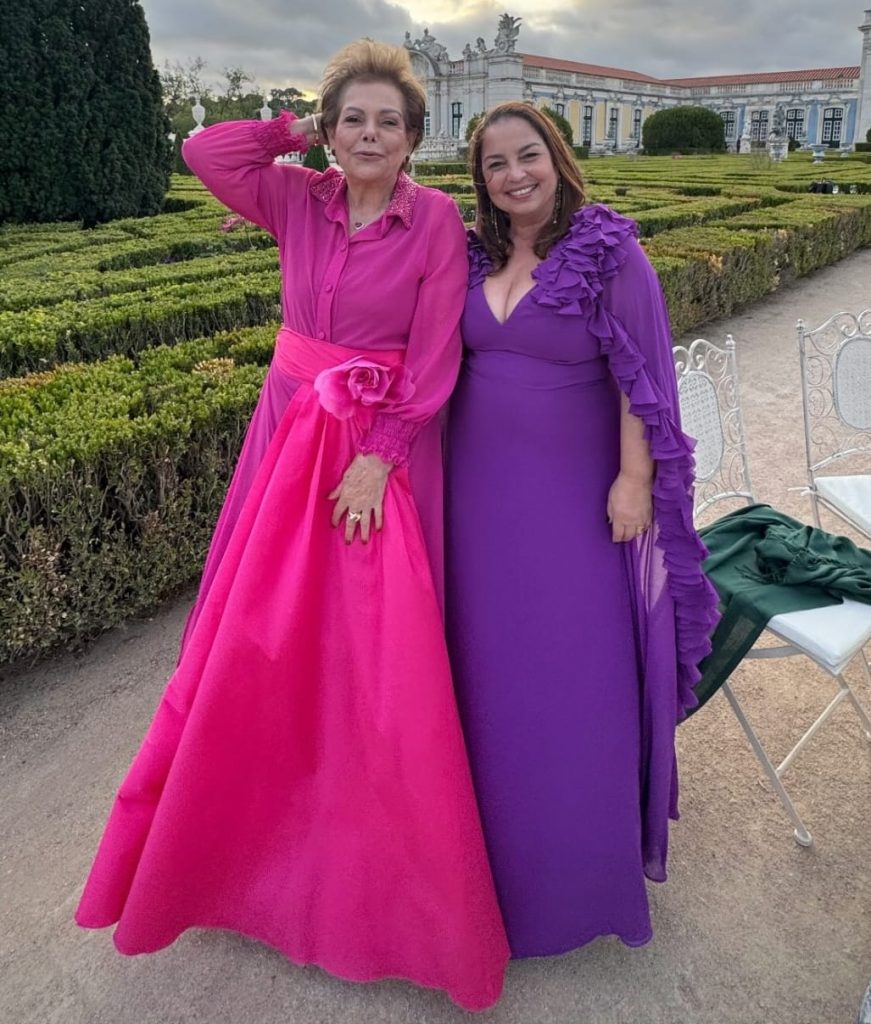 As chiquíssimas colunista Hilneth Correia e Mirtes Bezerra, no Palácio de Queluz, em Lisboa, para a cerimônia de Maria Luiza Gazzaneo Cabral e Lucas Sampaio. Vivas!