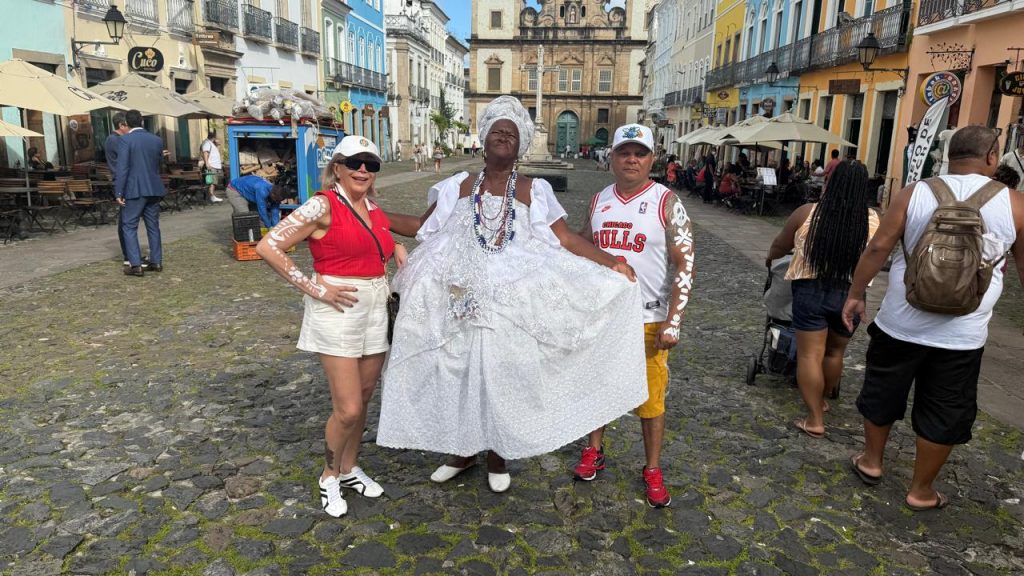 A amiga Zuzu Negreiros, curtindo férias do Banco do Brasil, em Salvador, ao lado do amor Wagner Caetano. Com direito às baianas do Pelourinho. Muito Axé!