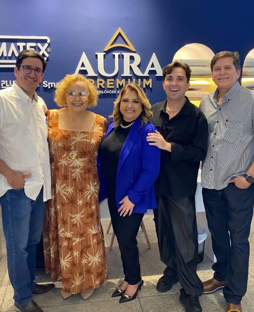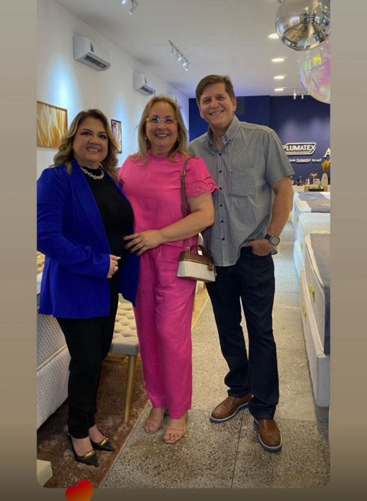 A empresária Geiza Pinto prestigiando o coquetel de inauguração da Aura Premium ao lado dos anfitriões Liliane Gastão e Henrique Costa.