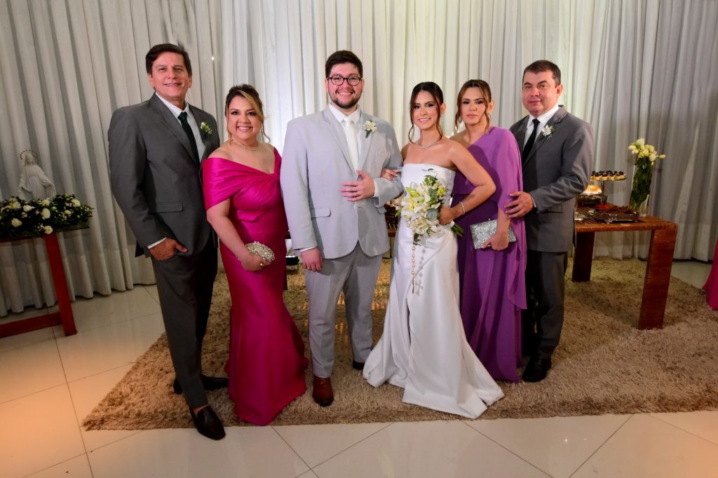 Os noivos Matheus e Marina com os seus pais Henrique Costa/Liliane Gastão e Starlynn Santos/Andrea. Abençoa, Senhor, as famílias, Amém. Foto Célio Duarte