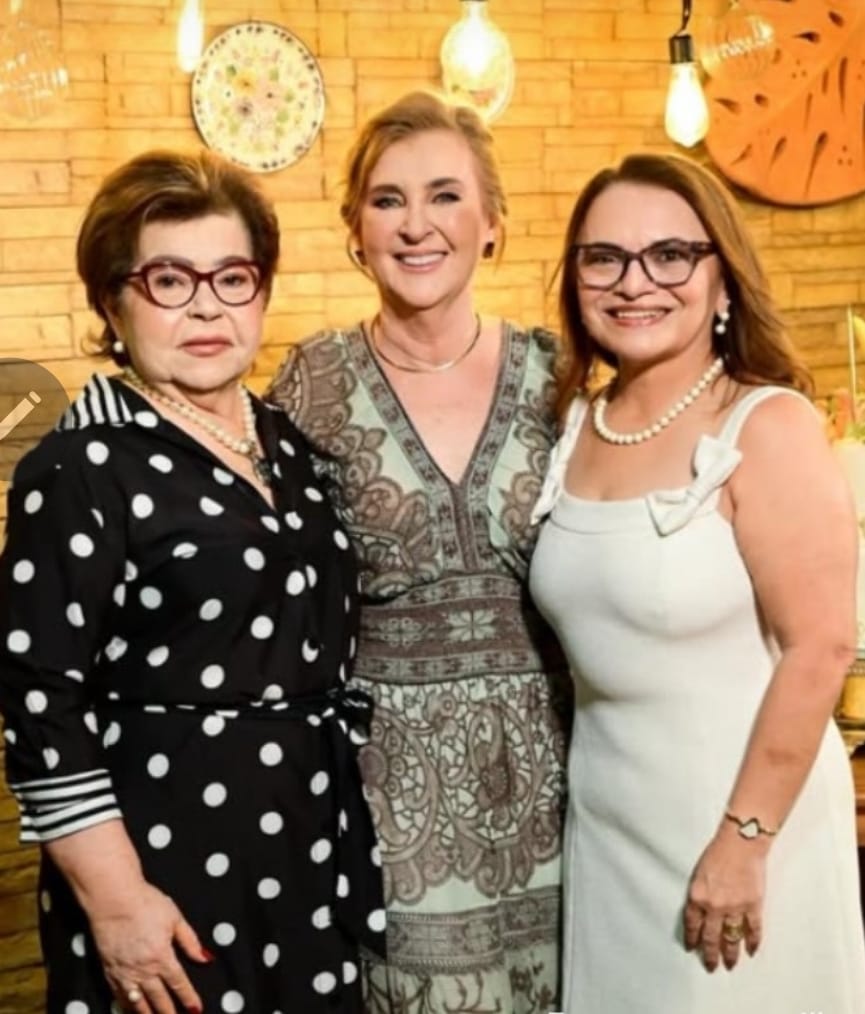 A aniversariante de dezembro, Betinha Rosado, recebendo o abraço das amigas Fátima Carlos e Vera Cidley. Tim-tim!