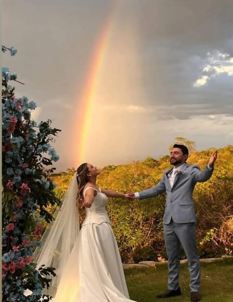 Mas como um sinal divino, abriu-se no céu um belíssimo arco-íris, afastando a chuva e emocionando a todos. Noivos, familiares e convidados ficaram extasiados. Para muitos, foi o pai da noiva, Raniere Paiva, que do céu enviou seus sinais.