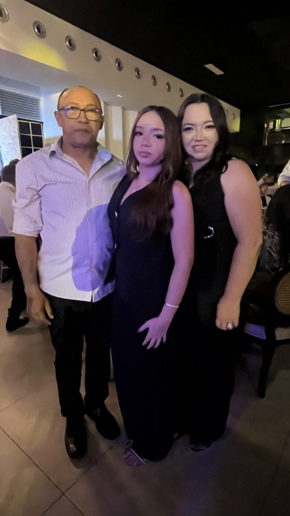 Sheile Medeiros e Claudevan Souza ao lado da filha Stefany, na noite festiva de José Maria de Oliveira.