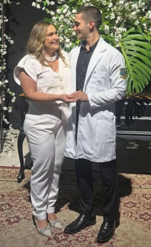 A Magistrada Daniela Rosado na cerimônia do jaleco com o filho Eduardo, que ingressa no curso de medicina da Ufersa. Salve, salve!
