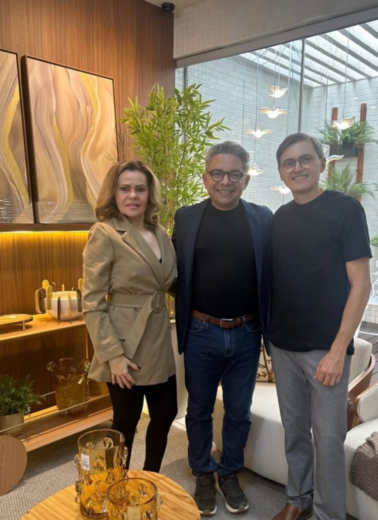 Os empresários Espaço Maia, Gláucia e Dinarte Jr, recebendo Carlos Zaranza durante curso de decoração.