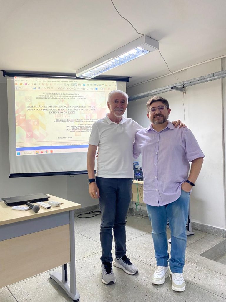 Nossa alma educadora vibra com o amigo Everkley Magno Tavares e a sua defesa no Doutorado com a tese de Avaliação da implementação dos Objetivos de Desenvolvimento Sustentável no projetos de extensão da UERN. No clique, com o seu orientador professor Doutor João Bosco Araújo da Costa.